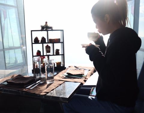 103楼的咖啡店,尖沙咀海岸线尽收眼底。
