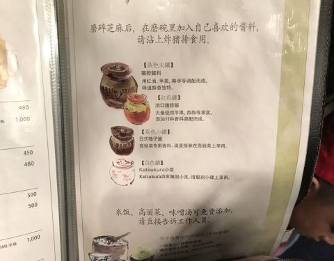 位于新京极街,非常不好找,门口是一条狭长的小路入口,很不明显,小径只能容纳一个人出入。进入后洞天大了起来,吃饭的时候客人非常多,需要等位。新京极来的外国人比较多,这家猪排店日本人吃的比较多。有中文菜单韩文菜单英文菜单。有三种猪排酱,如果点套餐米饭和味噌汤免费续。