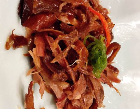 干锅鸡杂有点辣,但是好吃的呢,每次来必点黑糖粑粑 ,糯米团子外裹一层浓厚的黑糖酱,棒,正好中和了鸡杂的辣手撕酱板鸭很赞,推荐