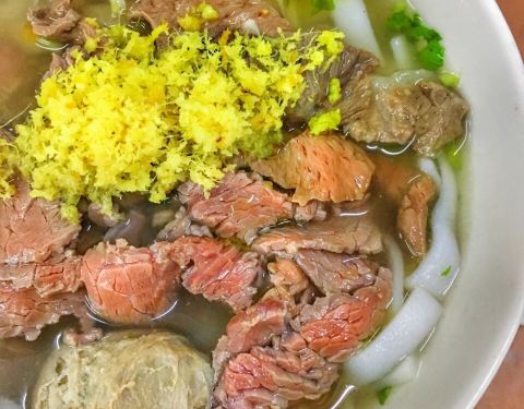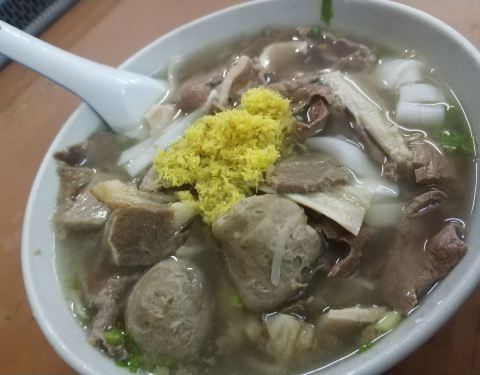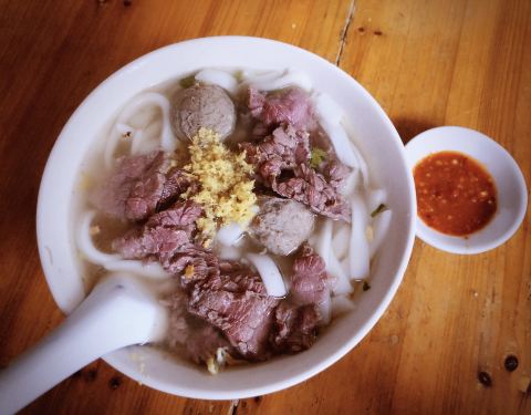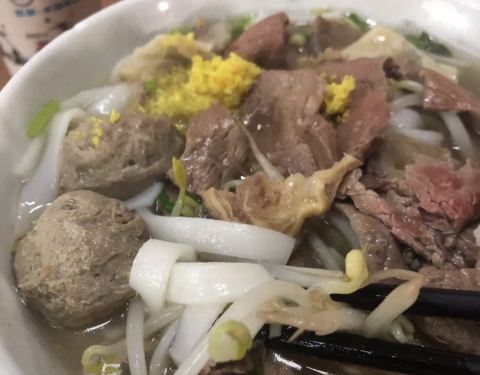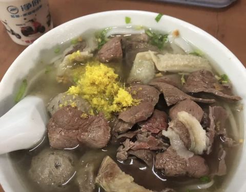 - 汤底很鲜 牛肉丸很Q弹,粿条上面铺了一层黄姜如果没说错的话,大晚上吃的热乎乎的,一定要加小碟子...