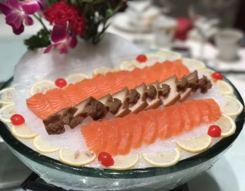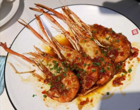 #老王探店#晚餐朋友们相聚映月梧桐,招牌台式辣虾每次必点。生啫鳕鱼,肉质嫩滑。三文鱼配澳鲍特别新鲜