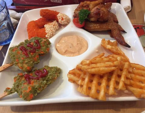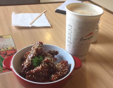在长白山旅游几天,除了吃酒店提供的自助早餐外,几乎中午晚餐顿顿都在吃东北菜,小鸡炖蘑菇、大拉皮、杀猪菜、乱炖,白菜猪肉水饺,连续吃了好几天,已是吃得不要不要的,好不容易在万达小镇上看到必胜客的熟悉店标,亲切感犹然而生,生意很兴隆,好不容易找到一个门口座位入坐,点了248的套餐,包括了前菜主食小点饮料甜品,省钱又省心,再加了10元钱可以点个超级大容量的水果茶,披萨一如既往的水准,黑椒牛排和鸡翅都很好吃,下载个东北必胜客APP注册一下还送了一对鸡翅,红丝绒蛋糕口感平平,不够香浓幼滑,东北大婶服务很热情,由于套餐内已包含了三杯饮料 ,加的水果茶只能打包带走了,服务员给分了两杯装,清新爽口,超级合算。