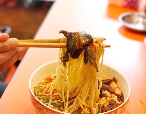 1)近大慈寺商圈,沿着锦江往东安南路走大约10分钟可以找到,是一个私房面馆的模式,对于外地游客还是比较难找的。2)屋里就4张桌子椅子,菜单用书法写了放在墙上的,没有图片供参考。最便宜的肥肠面20元一份,贵的鸡汤、炖鸡面70多元一份,是我在成都吃过最贵的面。3)鳝鱼面是最招牌的,33元一份,里面有大概6片油爆的鳝鱼,味道还真的不错没有刺口感微脆。松茸炖鸡面75元一份,里面鸡肉的确不是普通的,吃起来不柴,也有一点儿松茸点缀,价格的确有噱头的意思,味道不至于特别惊艳。4)店内只收现金,不给开票据。房间内有wifi,手机信号非常差,经常无服务状态