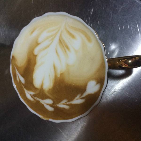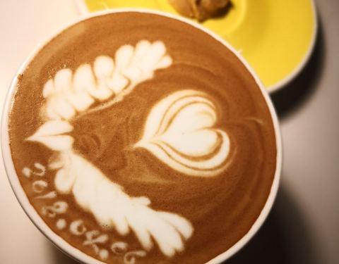 从点评的图片记录上看,这家店已经开了有几年了,门面开的相当的低调,甚至我在找这家的时候差点就走过了,可能周围的店铺和他家可能差距太大了。 进门最先欢迎我的是一只狗狗,相当热情,趴在我腿上欢迎我。眼睛很好看,而且非常听店家的话,等我安静的喝上咖啡后,它就乖乖的坐在旁边一点也不吵闹,很喜欢。 店里的客人不多,但是有几个外卖,店家也挺忙的,在店里转了一圈,店不大,感觉店里布置的很简洁,白色和木色的搭配也是我比较喜欢的风格。 点了杯薄荷拿铁,34元,店家问我咖啡要重一些还是淡一些,我说选重,可能有想多要点咖啡粉的占小便宜心态,但是结果是薄荷的味道很淡很淡,这个和店家木有关系,还是我太贪心。拉花很漂亮天使的翅膀载着爱心,旁边还有今天的日期,我觉得如果有重要的日子来这里点杯咖啡拍照纪念一下还是很有意思的。店家还很贴心的送了一块小曲奇。 店家的名字很奇怪,后来发朋友圈很多朋友问我是什么名字,我只记住了一个球,哈哈哈