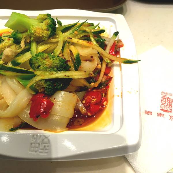 魏家凉皮(凉皮7分)11元 在打卡爱骅面馆的路上路过,突然想起有人推荐过的魏家凉皮,顺手进去了,估摸着我们买的地方不是总店,可能是分店的样子,忍不住吐槽一下,这店装修巨tm像肯德基,包括店员穿的衣服也是,我严重怀疑这店是旧肯德基店改造的,凉皮的味道比起子午路张记好多了,但是对于我等湖南人来说依旧过于清淡,有辣椒的香味在里面,面皮还算筋道,个人认为还有很大的提升空间,只不过我们买的这家店水平有限,如果整个魏家凉皮都是这味的话那我就失望了