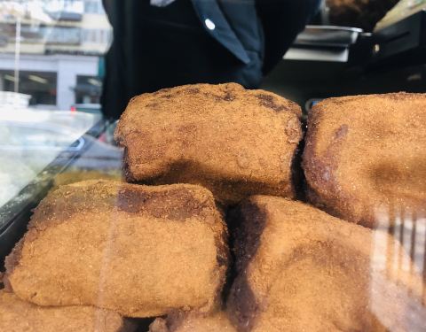 - 常见的【驴打滚】是小块的,可他家只能这么一条一条的买,一条就能塞满一整个打包盒