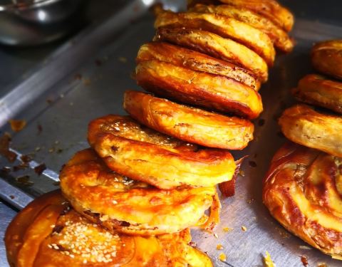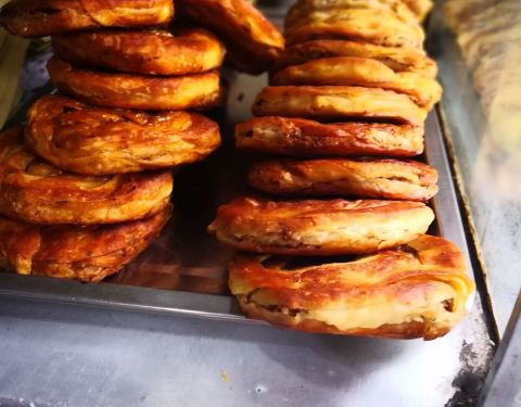 ...肉锅盔# 4元,应该用的是老油,闻着就是一股油香味儿,锅盔烤得还比较酥脆,里面的肉臊,也很好吃