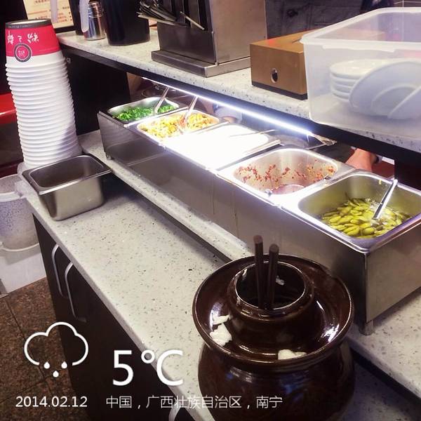 广西师大旁边的米粉店,汤鲜味美,尤其爱砂锅米粉,在湿冷的天气里给人温暖。泡菜虽然是免费的但好吃极了。