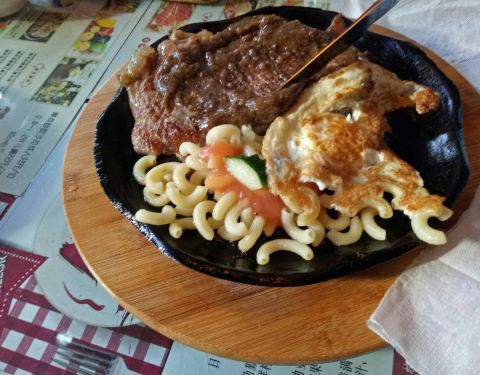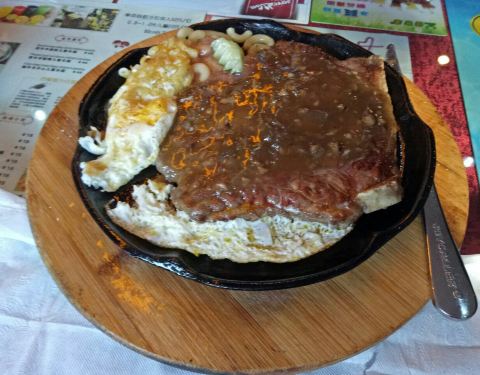 经常带儿子来这吃牛排,每月必到。这家主营牛排的全国连锁店,牛排味道正宗,环境不错,内有各式自助餐,品种丰富。儿子每次必点十分熟的澳式牛排加黑椒汁,我则喜欢七分熟的美式火焰牛排加香草汁,再自由拿取各种果汁,奶茶,牛奶,可乐,雪碧等饮料,外加水果,点心,糕点,汤汁,烤火腿肠,炒面,炒饭与熟菜,每次都吃得贼饱!临走前,儿子总又再去拿上一个冰淇淋。