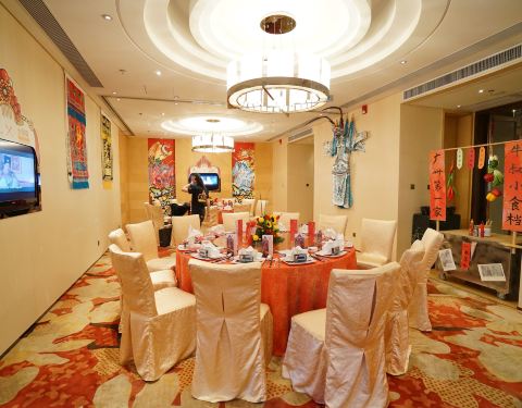 正佳万豪6楼中餐厅,周末中午去吃中式点心自助餐,电话预定位置时态度很好,主动询问了是否有小孩,是否需要bb凳,确定预留4人台和bb凳后,当天中午再一次致电和我确认。环境作为五星酒店配套的中餐厅,装修也比...正佳万豪6楼中餐厅,周末中午去吃中式点心自助餐,电话预定位置时态度很好,主动询问了是否有小孩,是否需要bb凳,确定预留4人台和bb凳后,当天中午再一次致电和我确认。环境作为五星酒店配套的中餐厅,装修也比较大气典雅,不知是否因为周末,人太多,已经安排在888小厅,还是比较吵闹,洗手间相对很脏,一地的卫生纸令人反感。同时由于人多,电话预留的bb凳很抱歉没有了。某团购的自助点心餐比酒店现场买单便宜了10[%]的服务费和6[%]的税,点心纸上的所有菜品无限制任点,周末有时间限制,第二轮是12:30到14:30,我偏爱饺类,点了虾饺(皮有咬劲,虾爽口),波菜虾饺,鲍参四喜水晶饺(有鲍鱼海参但味道一般),海参灌汤饺(吃了海参,饺子皮吸了高汤还好,内馅太多肥肉不好吃,没有拍照的干炒牛河本来不被看好,但是有锅气,芽菜韭黄牛肉河粉比例刚好,汁的湿干度也刚好,不显油腻,果然炒牛河是厨师必考科目,这货好吃基本代表餐厅的水准可。酥皮小蛋挞上得迟,开始担心漏,谁知由于新鲜出炉,酥皮皮薄多层酥脆,内层蛋汁鲜香甜度刚好,很赞。虽然后来点太多有部分点心最后没上取消了,但作为138一位的五星中餐自助点心来说,环境可以,食材较一般酒楼点心高级,如果周一至五品尝,可能会更满意