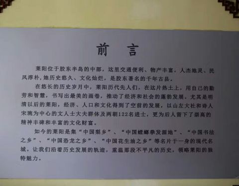 让我知道了莱阳的的事件,也让我知道莱阳是古代东夷历史的源头和摇篮地带走进大厅映入眼帘的就是这个大标语!让我知道了莱阳的的事件,也让我知道莱阳是古代东夷历史的源头和摇篮地带!