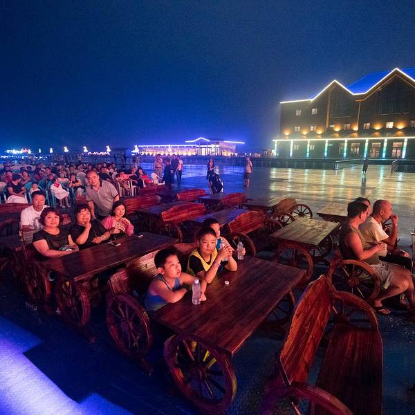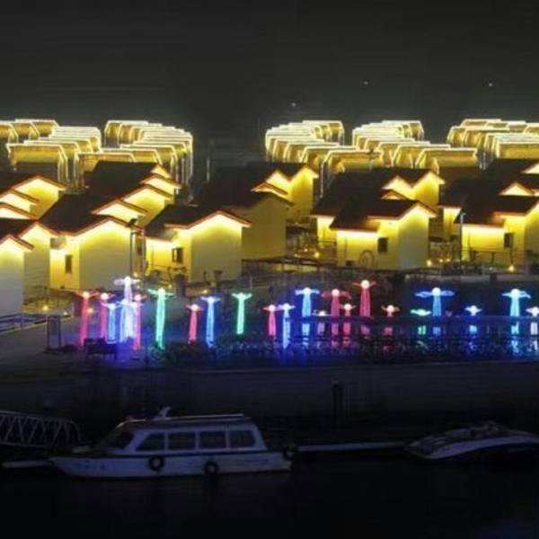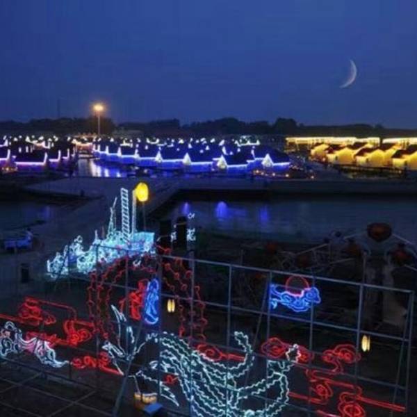 不得不说月坨岛的灯光,真的很豪华,处处都是各种造型,倒映在海面上,甚是好看。试想,如果有架无人机在上空拍出