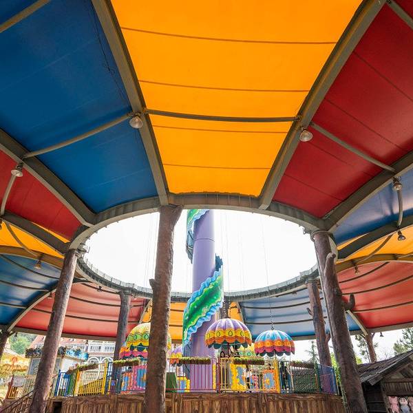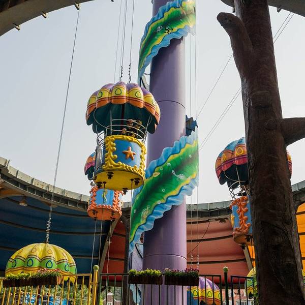 3、接下来就是失落丛林区域,会看到碰碰车、旋转木马、虫虫特工队、桑巴气球这类适合儿童的游乐设施,亲子游的可以打卡啦。大儿童可以玩旋转木马旁边的跳伞塔。
