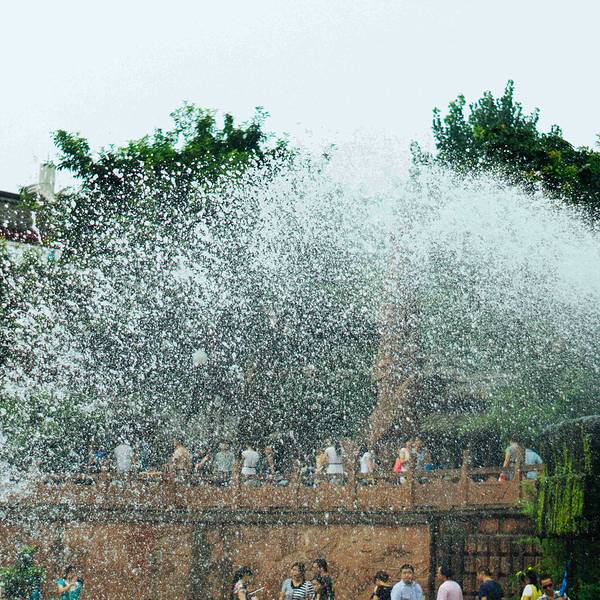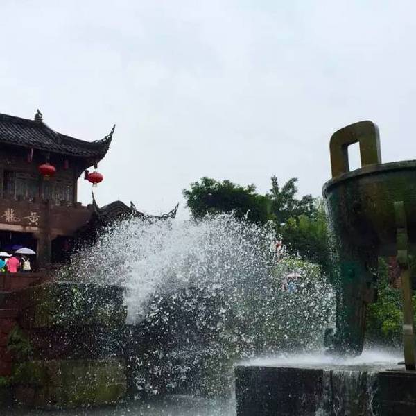 继续往前走会发现一个特别大的鼎,很多小孩子都在下面玩水。每到夏天,黄龙溪古镇就可以体验千人打水仗的盛况了。器具在景区都有买。