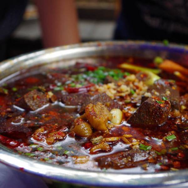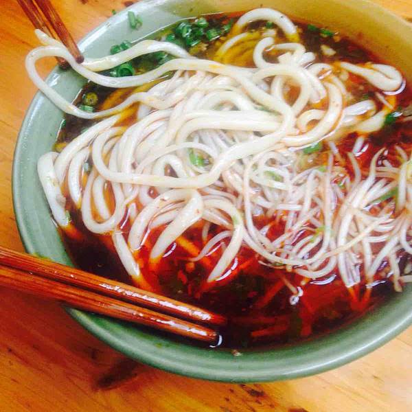 再往前走就是吃饭的地方,中午的时候生意异常火爆。这里吃饭的价格和外面餐馆价格差别不大,菜也是比较正宗的川菜,推荐肥肠血旺和回锅肉。如果比较喜欢吃小吃,不如就选择尝尝这边的一根面,古镇特色,一碗面就是一根面。