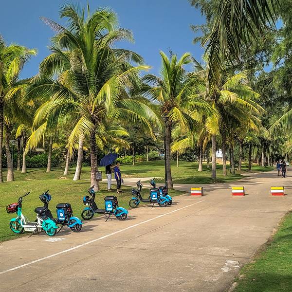 这里很多扫码的共享电动车,骑这个能快点,骑到接近海边的时候车就报超出范围不能骑了。