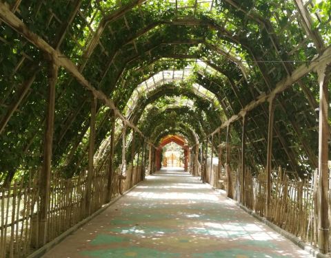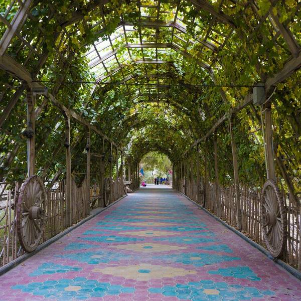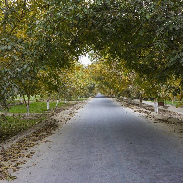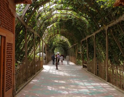 核桃王树耸立于喀拉瓦其村内,距新疆和田市区17公里。经考证,该树已有560多年历史,当属元代的果树,堪称老寿星。该树独占一亩天地,树高16.7米,树冠直径20.6米,主干周长6.6米,冠幅东西长21.5米,南北宽10.7米,树型大致呈"Y"字型,整个大树主干五人合抱围而有余。由于年代久远,主树干中间已空,形成一个上下连通的"仙人洞",洞底可容纳四人站立。入口直径0.74米,出口直径0.55米,可容游人从洞口进入,顺着主杆从树丫上端出口处爬出。细看树干皮色,粗糙而深沉,恢宏而古老,像画家笔下凝重苍劲的色彩,形状奇特,气势雄伟。葡萄架通道核桃园里买了一些纸皮核桃,36元/公斤。