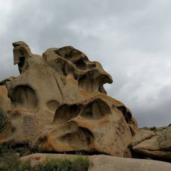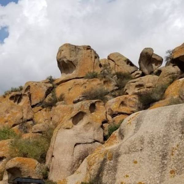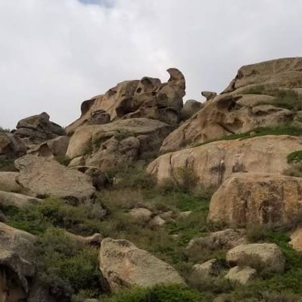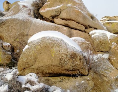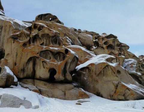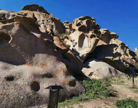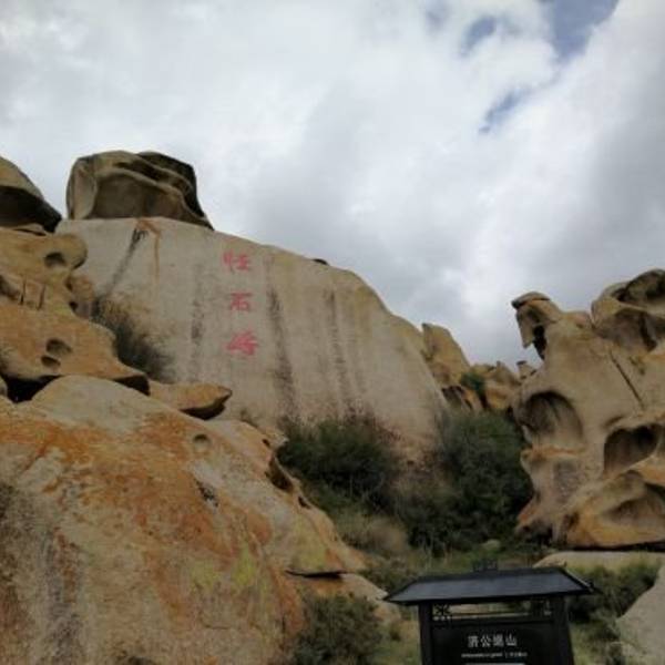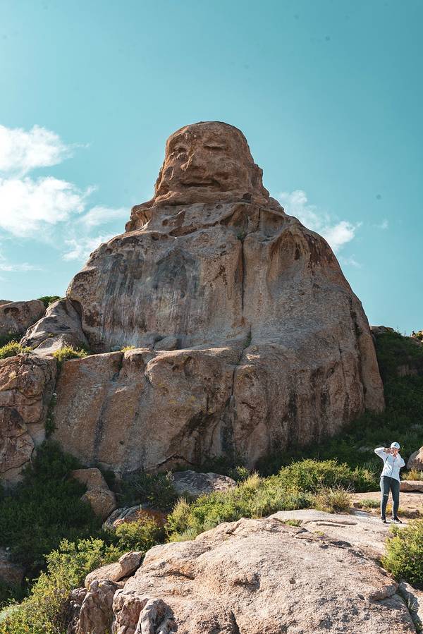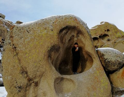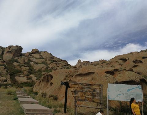 怪石峪是个在中哈边境钱上的风景区。一条笔直的公路一直来到怪石峪,公路两旁是高大的山峦,青青草原随处是羊群。当我们进入了景区大门之后,风景开始变得不太一样。黄色的花岗岩石从绿色的高山草甸中渐渐显现。穿过人迹罕至的公路,才来到这个神奇的地方。各类形状的“怪石”给崇山增添了不少趣味。最高处是一个像佛头的石头,曾经有不少善男信女来这里祈福。还有像各类动物的石头,有的像猪,有的像羊……这里是世界最大的花岗斑岩怪石群风景区。从科学角度来讲,怪石峪的风景地貌是在特定的地质、地理条件下发育的一种岩浆整合接触。由于两山高差悬殊,通过构造上升与外力剥蚀,将地下浅成的花岗岩大量剥落地表。一路上很多似是而非的象形石头的确很费脑筋,但是眼前这尊弥勒佛像似乎又像得太离谱。大自然一定很爱玩吧,不然他怎么会把这里变成他的游乐场?他一定很爱玩雕塑吧,不然他怎么会把这些石头上雕刻成各式各样的形状?大自然也很爱画画吧,不然他怎么会在石头上画出好看的图案。由于花岗岩是一种不透水岩石,降水后极易产生坡面流水和沟谷径流。加之这里属半荒漠气候,地表风化壳很薄又缺少植被保护。而阔依塔斯山花岗斑岩不仅斑晶粗大,而且节理裂隙特别发育,这就特别有利于风化,水蚀作用的深入。怪石峪千姿百态的孔穴地貌,实际上是亿万年来古代风化水蚀作用,大自然“蚂蚁啃骨头”长明雕凿的结果。所以,在漫长的岁月中,坚硬的石头都能被风吹出形状。如果人有梦想的话,付诸坚持,怎么会不成功呢?