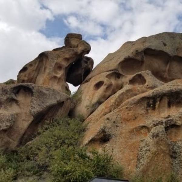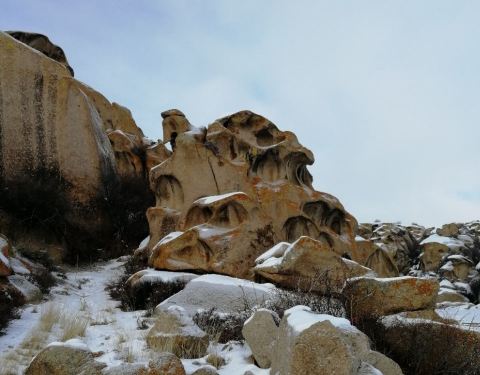 怪石峪是北疆的一个旅游景点,在博乐市,景区有各种奇形怪状的石头,由于新疆风特别大,很多石头风化,被吹成各种有趣的形状,形成了美丽的地质奇观。
