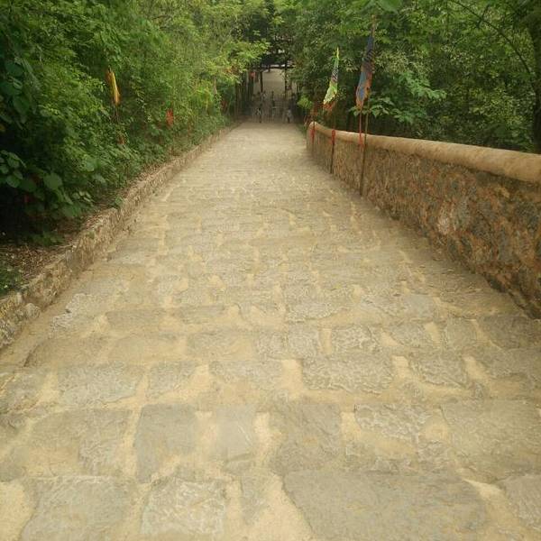 从县城开车去景点几公里。去时景点大门紧闭,一问才知维修,后问一大姐,热心告知有一后门。于是弃车步行,同行几个女将叫苦连天,没办法只得只身一人前去探路。估计一公里多点,即问到后门。