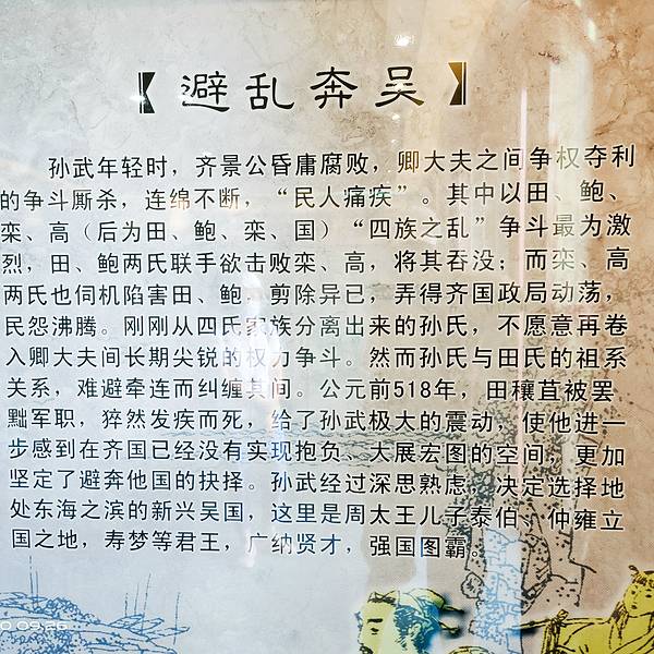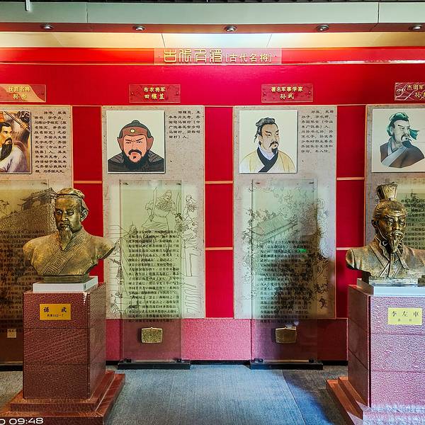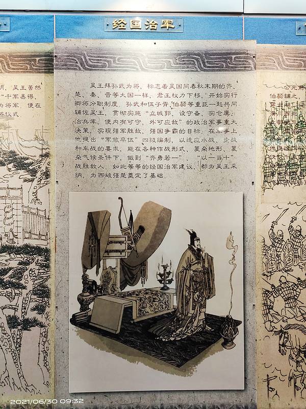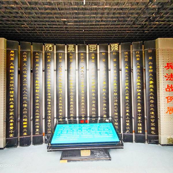 ...一手持宝剑的孙武的石雕像,正殿内有孙武伏案疾书的铜像,身后是展现《孙子兵法》精彩场景的大型壁画