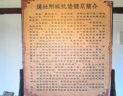 古色古香,也许就是浙南建筑的一大特色吧,还有城隍庙、妈祖庙、铁械局、跑马道及明代浙南民居群等多处古迹蒲壮所城,建于明洪武年间,至今已逾600多年,是一座保存完整的明代抗倭海防城堡建筑。城堡依山面海,南方正,北弧圆,平面呈“天圆地方”状。