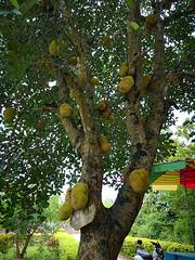 岛上信教的人不少,教堂翻修过,设施更普通教堂区别就在于进门的大厅门,用岛上特有的珊瑚石堆砌而成。教堂边有棵百年菠萝蜜树,结了不少果子。