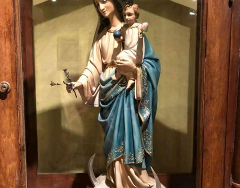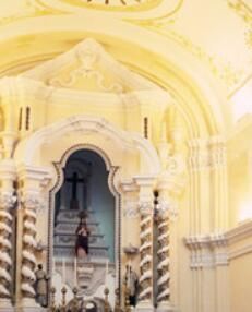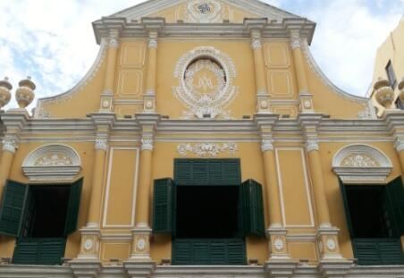 ...较鲜艳,而且整个澳门所有的教堂基本上都是这样的颜色,典型的葡式风格,里面有一个非常精致的圣母像