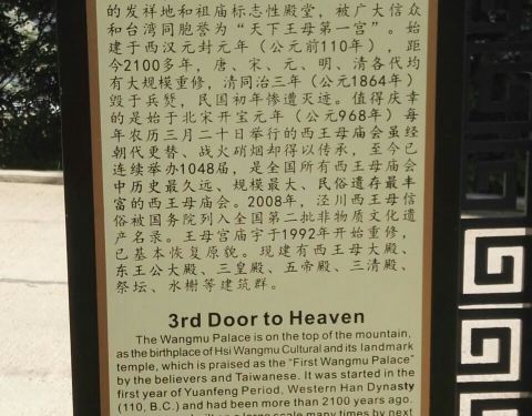 王母宫,位于甘肃省平凉市泾川县城西,景区主要由王母宫、瑶池、回屋、石窟四个景点组成王母宫,位于甘肃省平凉市泾川县城西,景区主要由王母宫、瑶池、回屋、石窟四个景点组成。相传这是西王母的降生地,门票60元,但遗憾的是没有多少看点,一是石窟正在维修,不开放,所以只看到几间烧香的庙宇。