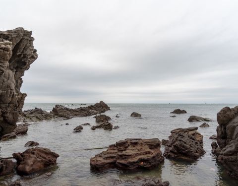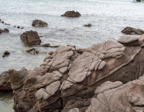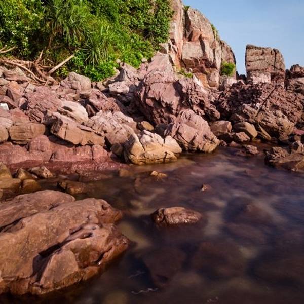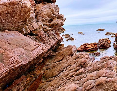 怪石滩位于 防城港 市 江山 半岛景区的南端,景如其名,这里的海滩系海蚀地貌,分布着成片的石滩,怪石嶙峋,沟壑纵横,形状各异,当地居民因此取名怪石滩。因石头呈红褐色,又有“海上 赤壁 ”的小名号。怪石滩只有中间一片是沙滩,两边都是奇异的怪石,东侧的石头形状更为丰富。在这里可以看海上日出、日落,傍晚时分,天际线湛红的夕阳染 红海 平面,可以看到零星的几对新人在石滩上拍摄他们的誓言。【TIP】怪石滩的石头近海被海水打湿的会很滑,有些石头的棱角会很锋利,这里的路不好走,建议穿运动鞋或者防滑性较好的鞋子。我们当时就因为鞋的问题,行动缓慢,没有走到头就日落了 ……“当风筝厌倦了天空,
