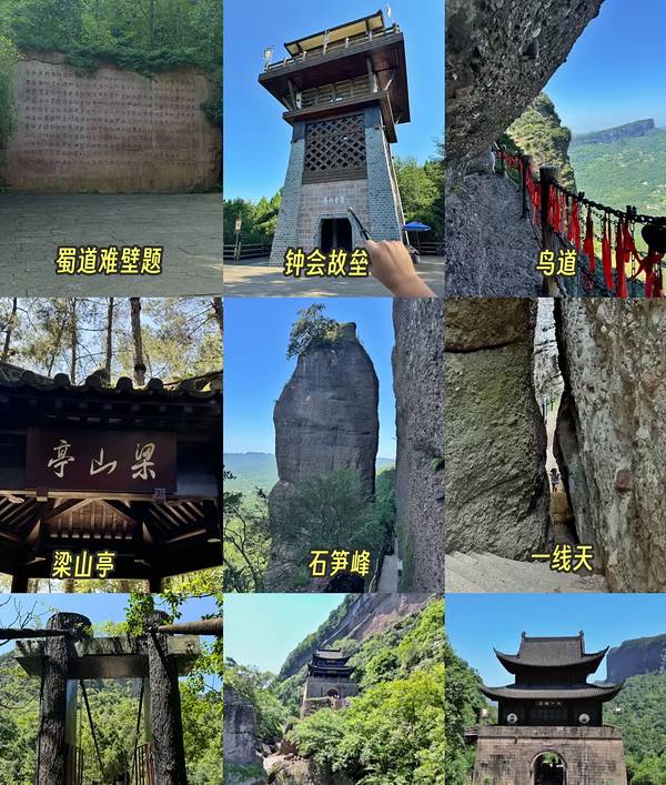 “一夫当关,万夫莫开”的剑门关位于四川剑阁县城南大小剑山中断处。剑门关的核心景点有:一线天、天梯峡栈道、鸟道或猿猱道、玻璃观景台以及关楼。 从景区北门坐索道到半山腰,然后你可以选择鸟道或者猿猱道到山顶。猿猱道非常险,需租用专业登山装备攀登上山,非常惊险刺激,可以真正体会“猿揉欲度愁攀岩”。鸟道上山则相对较容易,只有部分台阶较陡,可以体验“西当太白有鸟道”的乐趣。到达山顶后可以在玻璃观景台欣赏剑门关的壮美风景。 从南门一路过去的核心景点便是关楼了,站在关楼上,感受一夫当关,万夫莫开的情景。原本的关楼几经损毁,大家现在看到的关楼是2009年左右在原址上重建的建筑。