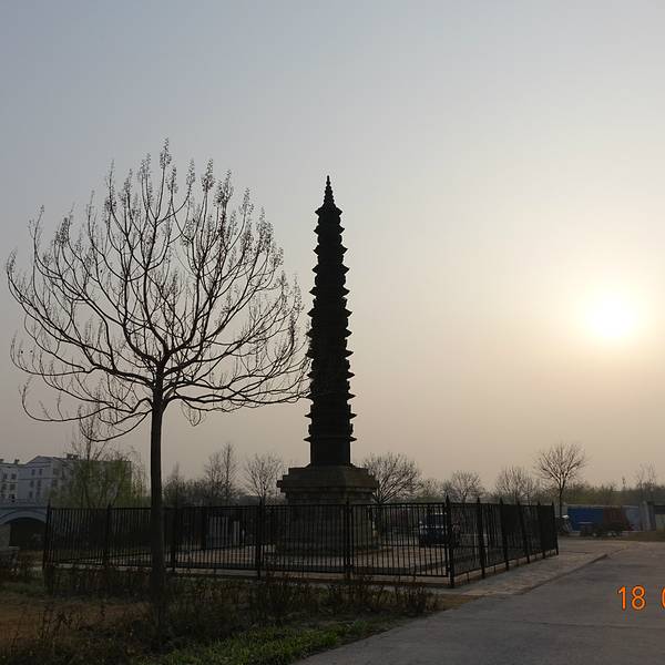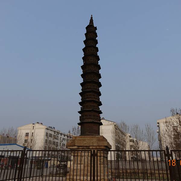 聊城铁塔,塔始建年代据推测,当在辽或金。有将近1000年的历史。感觉这个塔更像是立起来的钢鞭聊城铁塔,塔始建年代据推测,当在辽或金。有将近1000年的历史。塔为生铁铸造13层,高约15.8米。感觉这个塔更像是立起来的钢鞭。用铁栏围起。周围树立一块隆兴寺铁塔的石碑。