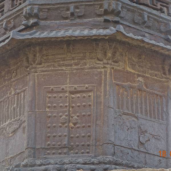 隆兴寺铁塔不同于其他的古塔,更似一个放大的艺术品,只供观瞻,不能攀登。远望,又高又细,突兀的伫立于原护国隆兴寺东南角,仿佛一根铸铁疙瘩棒。近观,塔身四面门窗、斗拱清晰可见,塔基石雕龙凤、人物栩栩如生。唯独不见地宫内出土的辟支佛舍利子。