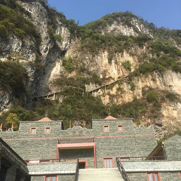 羌情园索道口旁边就是走路往情人桥方向的台阶。一路向右很快就到大禹文化园,然后向下走,在穿过几个建筑,一路向山下走。情人桥附近还有溜索和索道可以到情人桥去,距离很近,不坐就要走绝壁栈道(路程有点难度,有一段80度差不多吧)。不恐高的可以体验一下绝壁栈道~~~~哪里的风景还是很漂亮的,险路就只有一段,下来就是观音崖了,路不错,虽然也是悬崖上,但是平坦多了。一路就到了情人桥,可以拍拍照,桥还是很温柔,基本都能过的,实在不敢走的,旁边有山路,就2-3分钟的事。情人桥那里还可以玩超级大秋千,我看到有一对情侣在荡秋千,突然想到一首歌(我和你荡秋千,荡到了天外天.......),我反正是没有勇气去尝试的,还有云中漫步,这个倒不怎么吓人,可以接受,不过如果中途踩空,估计也会吓尿~~~情人桥过去就是猿王洞了,这个强烈安利,还不错的,猿王洞算是一个天然溶洞了吧,里面还是比较大,前段的景色真的一般,后段景色真心还可以(大约30分钟),洞内还有自助语音介绍,里面的钟乳石也是形状各异,配上彩灯也算小小惊艳了一把就是洞里面有些角落黑乎乎的,一个人走真心有点小怕,真担心一不小心蹦跶出来一个人,piapia出了洞口休息会,给身体补给补给,就准备原路返回啦,哎 我还是会想念这大山的空气和小姐姐啦总结: