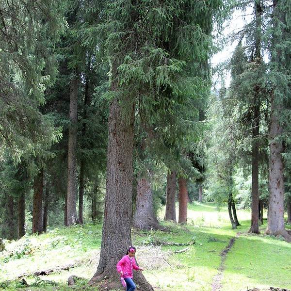伊犁河畔的那拉提山是雪岭云杉最为繁茂的地区。温暖湿润的独特气候,促使云杉生长快、密度大、成材率高。这里的雪岭云杉,树高达50~60米,年轮都在300~400年以上。树冠狭长,主干粗壮笔直,犹如收拢的巨伞拔地而起,层层叠叠。每公顷可产木材1000立方米以上。如此高大广阔的原始森林,就是在全世界也很罕见,堪称天山森林的精华。