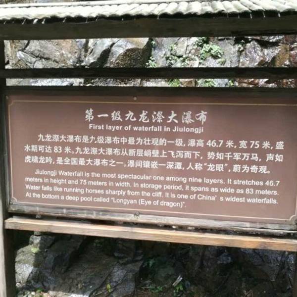 九瀑各展奇姿,各具特色。其中,第一级瀑布最为壮观,瀑高46.7米,宽76米,丰水期可达83米。瀑流经陡峭的崖巅腾冲跌落,直泻深潭,声如轰雷,震撼山谷,瀑花飞溅,激化为迷蒙烟雾,弥漫山谷,若逢斜阳映照,幻成彩虹横空,斑斓耀眼。巨瀑右上方还有一个直径14米的潭穴镶嵌瀑间,人称“龙眼”。第四级称为龙牙瀑,瀑长46米,瀑面中有巨石突兀,形似龙牙,把瀑布扯成两半,故名。两股瀑流冲进一个面积为2800平方米的“卧龙潭”。