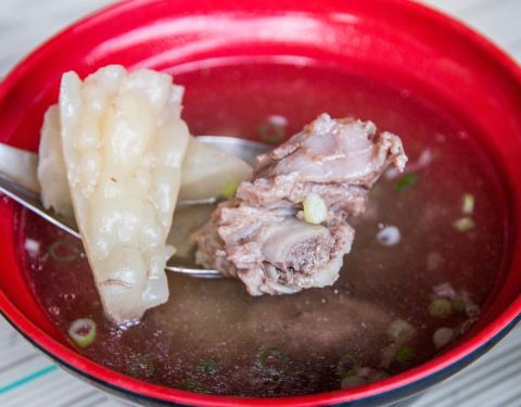 筒仔米糕就是卤肉饭做成的筒子糕,类似于竹筒饭,感觉和吃粽子差不多,就是太油了,个人觉得还是卤肉饭好吃,那个排骨汤挺不错的。