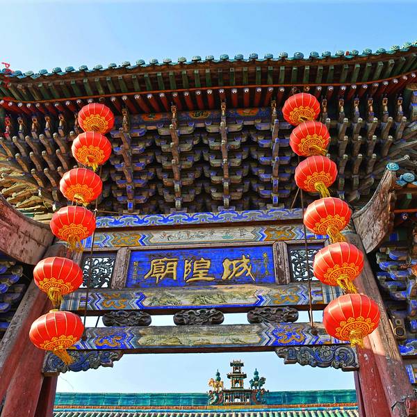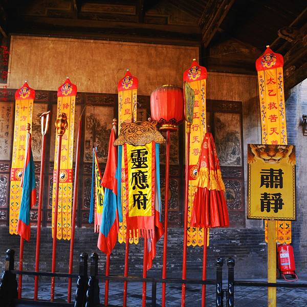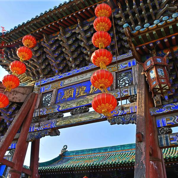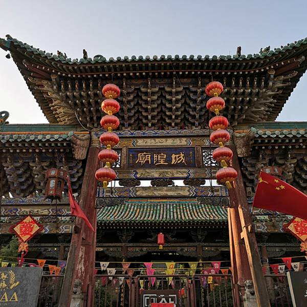 平遥的城隍庙,始创于明朝初年,是目前国内保存完整的城隍庙之一,它是一所规制齐全,宗教、历史文化丰厚的道教庙观,除正殿和寝宫外,主要由六曹府、土地祠、灶君庙、财神庙四大部分组成。城隍庙按照“天人合一”的礼制,以城内南大街为轴,同平遥古县衙东西相对称,城隍庙居上首。城隍庙布局规整、层次分明、气势宏伟、风格别致,“前朝后寝”的功能分区体现得十分鲜明,处处折射出一股阴世、阳间轮回转动的森然气氛和天网恢恢疏而不漏的传统思想。城隍庙的总体布局的特色还体现在“庙中庙”的配置上,灶君庙和城隍庙分置在城隍殿东、西两侧,组合成“诸神共居一庙,联袂同受香火”的奇特景致。另外,城隍庙大的特色是建筑结构与琉璃艺术,整座庙区内,殿宇、廊庑、楼阁、坊、台形制多样,结构精妙,而满布殿宇屋顶的琉璃更叫人称奇、心动,蓝、绿为主黄色相间组成的青冷色调装出神秘的意境,其仙人,走兽、龙吻背刹,造型精美色泽如初,是清代琉璃工艺的杰出范例。
