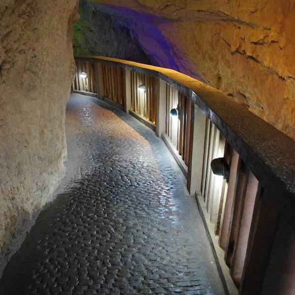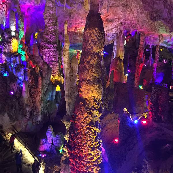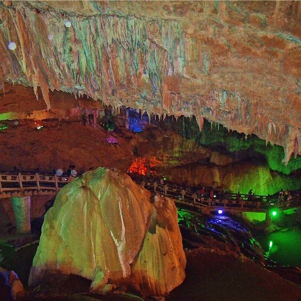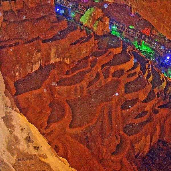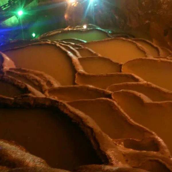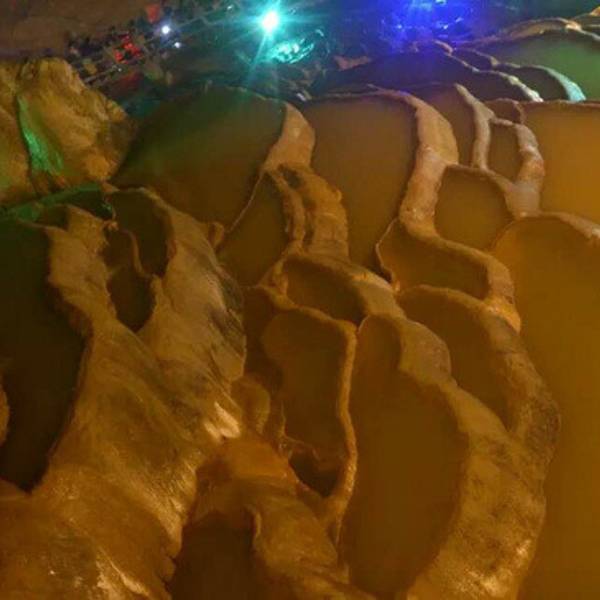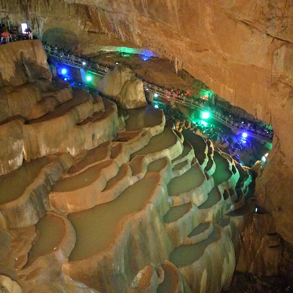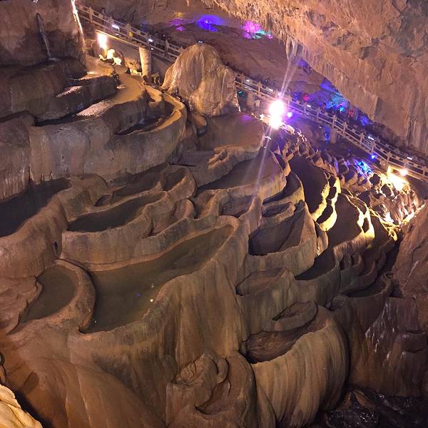 “神田”,不得不说真的很神,从上到下,错落有致,大小不一,每个梯田里都充满的水,在灯光的照耀下,金灿灿的,甚是惊人;如此奇伟壮丽的景观,为世界上罕见的一大奇观,被国际洞穴专家誉为世界之最。电影“千机变2花都大战”就是在此取景拍摄的。