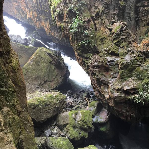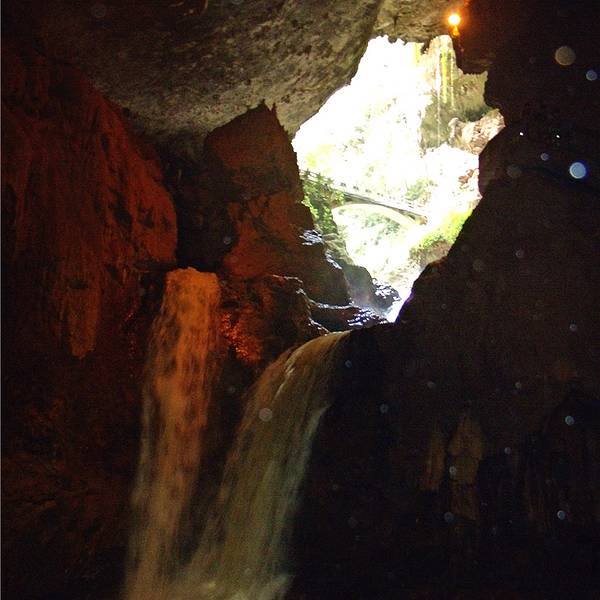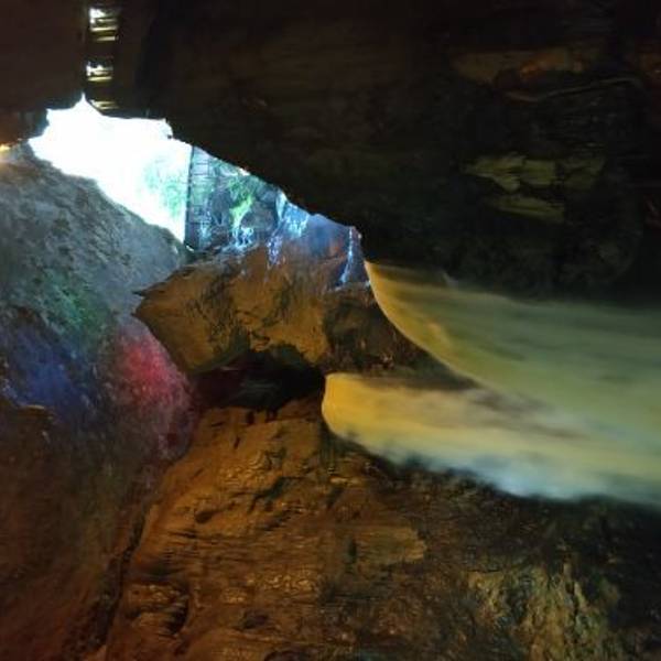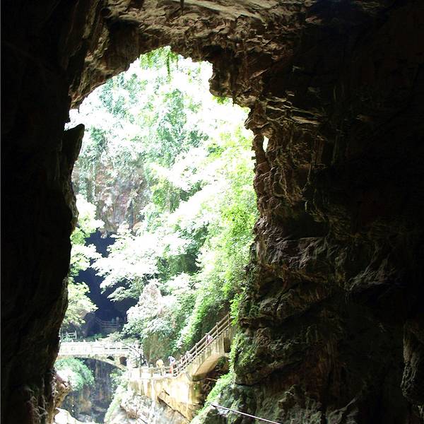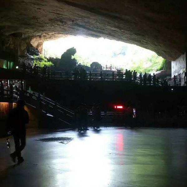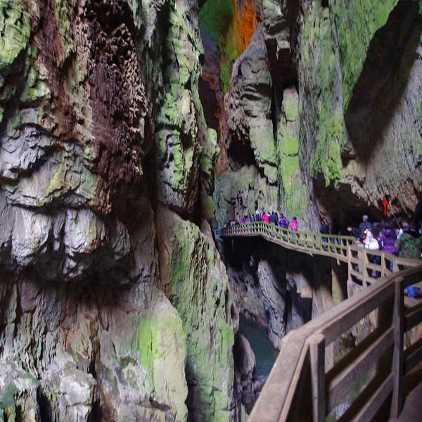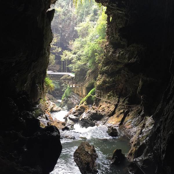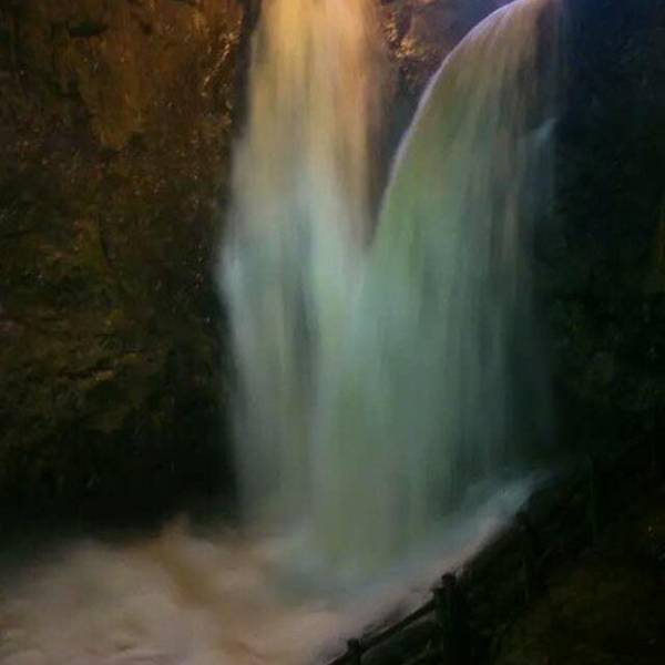 看到浩浩荡荡、气势磅礴的瀑布,站在通道上面观看,有种心惊肉跳的感觉,你完可以体会到由于瀑布急流拍打两边石壁导致木通道晃动的感觉。瀑布上面是“惊魂峡”,峡谷最大的落差有上百米,地理位置很是险峻。紧挨着就有一片很宽广的观景广场,从洞内看向外面,宛如一个破了洞的“天口”,洞内某些地方完全看不到外界的光线,这样更能衬托出洞内灯光的神奇。