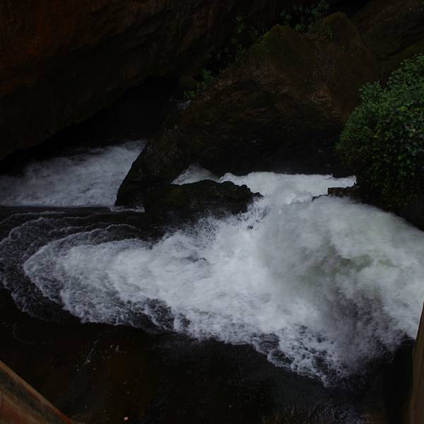 “雌雄瀑布”,比前面看到的瀑布更为奇观,水流分别由一高一低的岩洞中奔来,一齐下泻,瀑高30米,下注清潭,潭深10余米,瀑水声吼,水珠纷飞,不由惊叹“八十丈虹叠双桥,一千斛玉落九霄”,站在观瀑台的我竟忘记了移动脚步,有点恍如隔世的感觉,好像刚才是灵魂出窍,不知自己所处何处了。