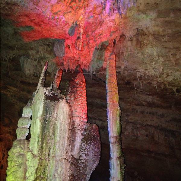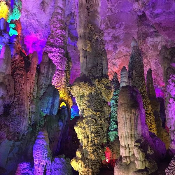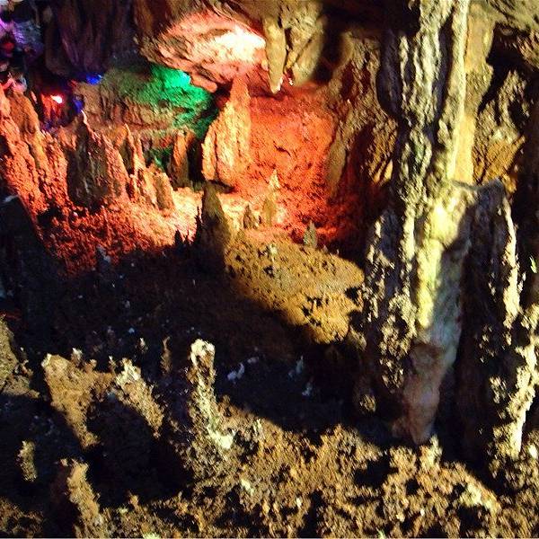 洞内的景观很多,由于我们是自己进来观看,很多景观都不知道怎么称呼。最让我震惊的是看到一大群“擎天柱”,那些石头从下直抵洞的最上面,好像是把整个溶洞给支撑了起来,尤其是在不同灯光下映射出不同的颜色,给人一种震撼的力量。