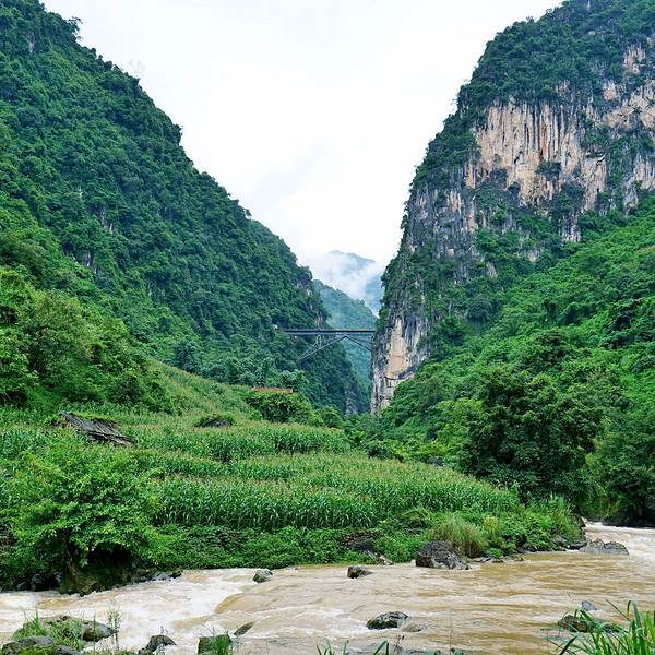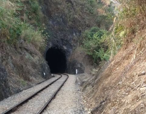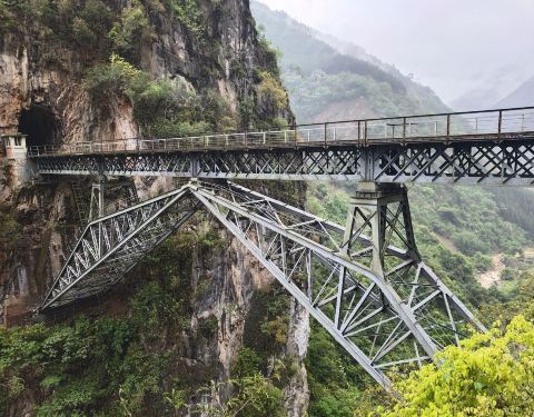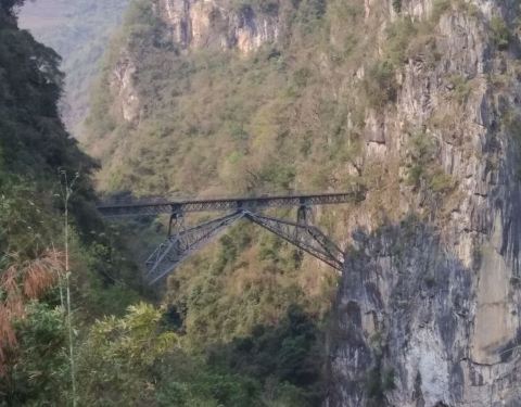 人字桥距离屏边县56公里,是清光绪22年法国人修建的,死了中国劳工800多人。这里不通班车,只能自驾、租车或包车去,必须是越野车或面包车,轿车进不去,路太烂。先走大约一个小时的盘山公路,再走两个小时的土路才能到,沿小路进去,栈道是通往桥下面的,顺着栈道边的一条小路上到半山腰,穿过一个铁路涵洞,就到了桥面上了,一座漂亮的铁路桥,这里不要门票。