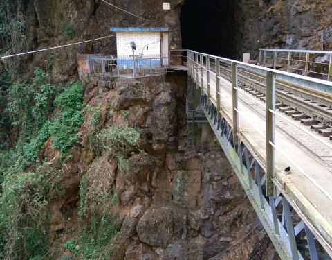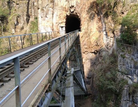 ...着栈道边的一条小路上到半山腰,穿过一个铁路涵洞,就到了桥面上了,一座漂亮的铁路桥,这里不要门票