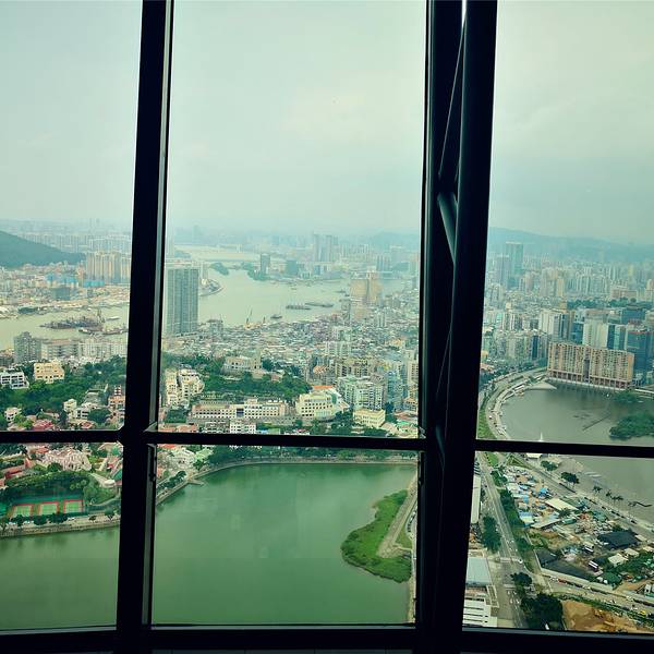 澳门塔的一楼是一个商场,出售一些服装和电子产品,但是感觉没有什么人气。进入商场后再乘坐直达电梯可以到达观光层。澳门塔总高度为338米,澳门塔的58楼是室内主要观景台,在观景台上可以俯瞰澳门全景:小小的弹丸之地澳门既有鳞次栉比的高楼大厦、造型别致的酒店,也有造型朴素的居民楼......澳门的空气质量不错,我去的那天虽是阴天,也能看到很远。观光层的地面是由特殊玻璃制成的,可以透过透明的玻璃向下俯瞰,仿佛凌空悬浮在半空中,不过有恐高症的人可能会感到不适哦。再往上几层还有空中酒吧、旋转餐厅、室外观光走廊等。有兴趣有胆量的游客可以去六十一层体验蹦极跳等极限运动,或是体验在空中漫步的刺激感。观光塔内还有现场直播游客蹦极的视频,不敢亲身体验的游客也可以看现场视频体验一下刺激的感觉,过一把瘾。如果没有这么大的胆子,也可以在此拍些照片留念,整片整片大大的玻璃墙是拍摄剪影的好去处。 展开