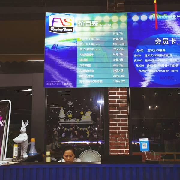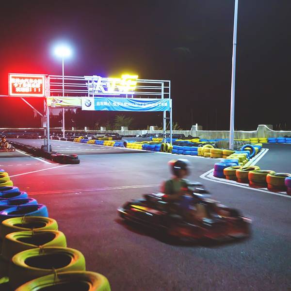 饿的过了头,吃的有点多了。大晚上回去睡觉肯定又要长二斤,索性附近溜达溜达。没走几步,看见了一个汽车公园,所幸无事情可做,进去瞅瞅。大堂里明亮,摆放着各种赛车比赛的奖杯。吧台上面有个价目表写着玩各种车的价钱。刚吃饱还是先溜溜吧,于是没买票随便进去逛逛。穿过一个汽车漂移的场地,后面是好大一个卡丁车场。