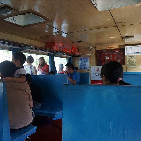 上舱总共二三十个座位,也就坐了十几个人,看得...上船以后,工作人员让我到上舱,告诉我需要另交10元空调费。这个加钱倒是不贵,而且上舱是可以出去到舷窗边和平台处观景拍照的,下舱应该是本地人坐的,不能出来。