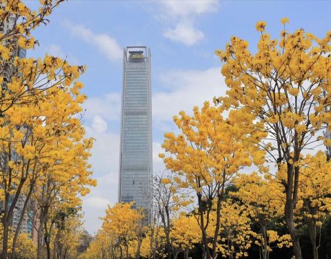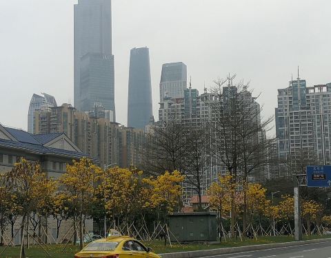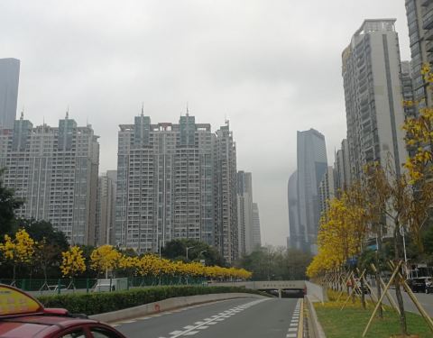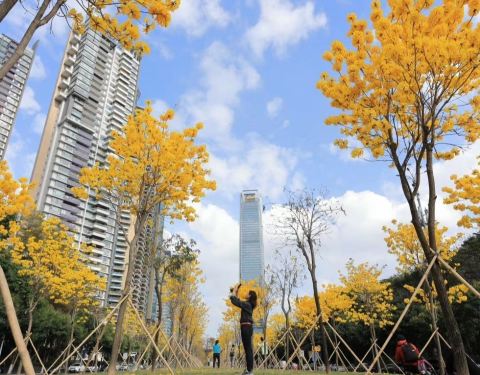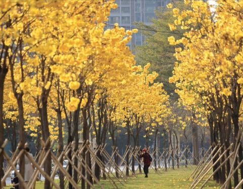 【春季到广州来看花:黄花风铃木一】 广州街头越来越多这种嫩黄的花树了!这不,在珠江公园北边这条金穗路上,路上三大排都是。 她叫黄花风铃木,是紫葳科,风铃木属落叶乔木,高可达5米,树皮有深刻裂纹,小叶片...