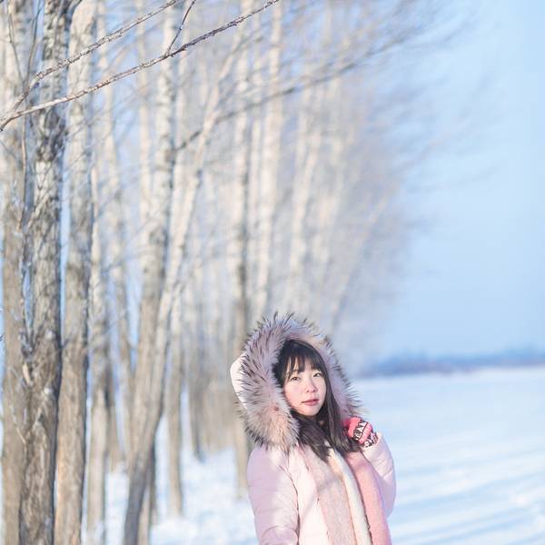 湖面上一排整齐的白桦树在阳光的照射下显得十分好看。果然是寒从脚入,在冰上待了一小会,脚就冷的不行,拍了几张照片我实在受不了了,赶快躲到车上去,还好车上有暖气。感觉照片中的自己都被冻的有点懵。