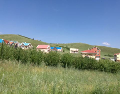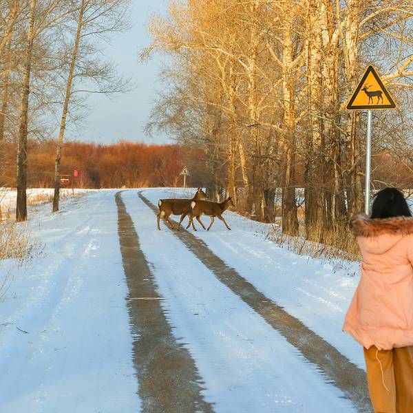 跑到离我们有一段距离的地方,狍子们转过头看着我们。能感觉到它呆萌呆萌的样子吗狍子和鹿很像,两个的区别是狍子屁股后面是一个白色的爱心。回头仔细看了一下,它屁股后还真的是一个爱心的形状呢。到达一个村庄,这里就是凤凰山滑雪场了。